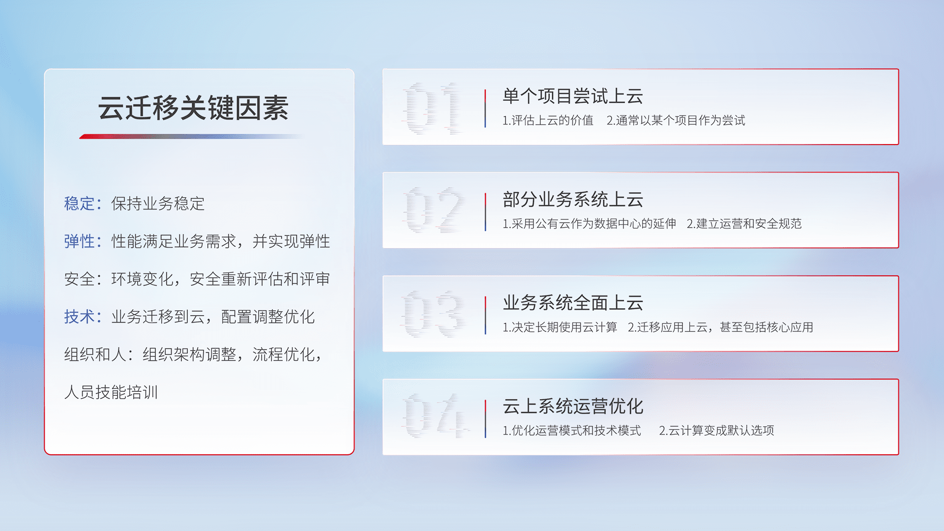 结合实际业务,,,从规划设计、、云平台选型、、云原生改造、、、、数据迁移、、、集成交付,,迁移全过程为客户识别最佳上云路径,,,做好风险识别管理,,,,设计网络架构、、、身份权限、、安全审计合规、、操作审计、、、日志审计、、监控告警策略、、、多站点容灾设计等,,对云上基础设施进行整体规划,,,提升IT治理水平,,,以满足弹性、、高可用、、、高性能的需求。。。